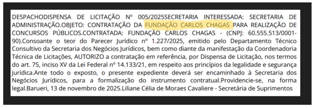 A banca responsável pelo certame já foi definida. A empresa contratada foi a Fundação Carlos Chagas (FCC), segundo o documento publicado no Portal Nacional de Contratações.