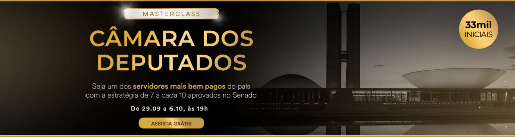 E para te ajudar, preparamos o MasterClass Câmara dos Deputados com tudo o que você precisa para ser aprovado e conquistar salários de até R$ 33 mil. Clique no banner abaixo e participe!