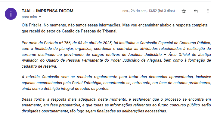 E para trazer mais detalhes aos leitores do blog da Coruja, o time de jornalismo do Estratégia Concursos contactou a imprenssa do TJ AL para saber se o número de vagas já foi definido e se já tem previsão de cronograma.