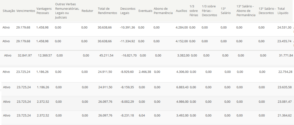 Entretanto, na realidade esse valor pode ser ainda maior com os adicionais e gratificações. Para exemplificar melhor, trouxemos abaixo o valor real recebido por servidores ativos no cargo. Conforme o detalhamento, mesmo após os descontos obrigatórios, o salário costuma ultrapassar os R$ 20 mil: