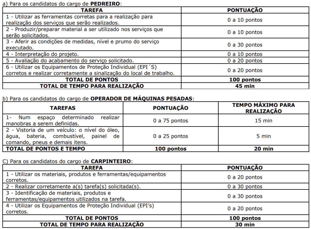 - Prova prática (eliminatório e classificatório) para os cargos de Carpinteiro, Operador de Máquinas Pesadas e Pedreiro.