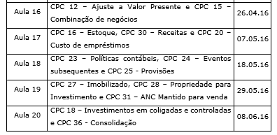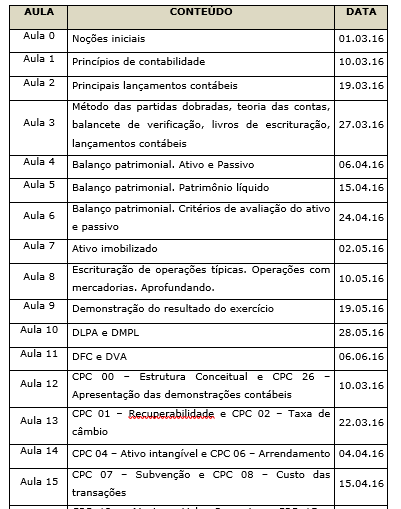 Pessoal, como muita gente já tem conhecimento da matéria e quer ir estudando a contabilidade avançada, fizemos um cronograma da aula 0 até 11 (que começará em 01.03 e terminará em 06.06) e outro cronograma para os CPCs (que começará em 10.03 e terminará em 08.06). Ou seja, até junho você terá um curso completo e totalmente atualizado de contabilidade.