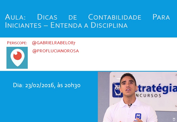 O nosso segundo ponto é um convite. No dia 23.02.16, às 20h30, realizaremos uma aula, via Periscope, para INICIANTES na Contabilidade. Será direcionada para aqueles que nunca viram contabilidade na vida ou para quem sente muita dificuldade mesmo. Não entende o porquê de creditar ou debitar. Ensinaremos o básico! Como fazer um lançamento, o que é razonete, entre outras coisas.