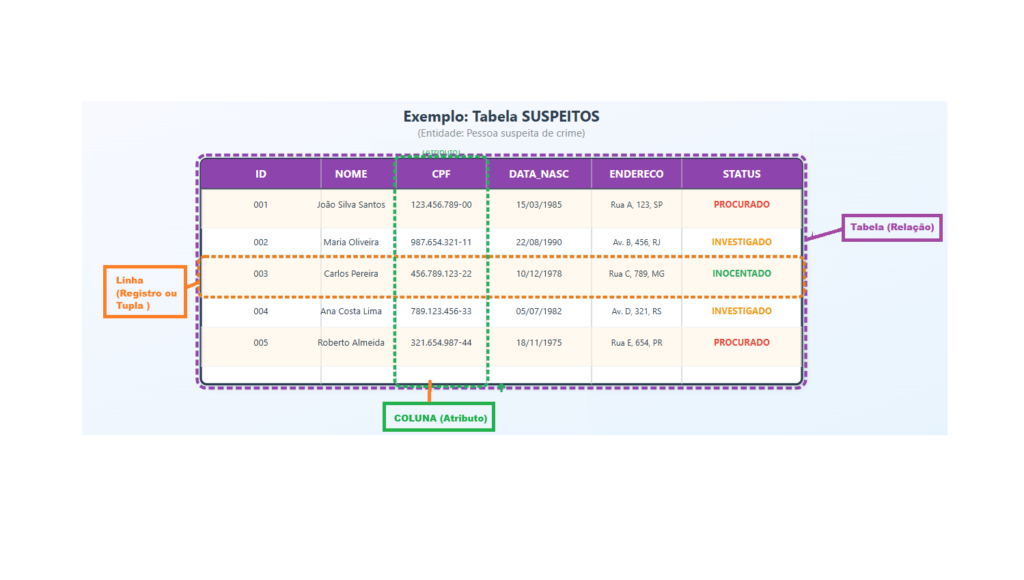 Linha (Registro): Representa uma instância específica da entidade. Por exemplo, um suspeito específico na tabela de suspeitos.