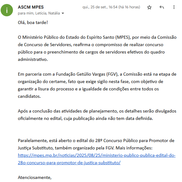 O Ministério Público do Espírito Santo, por meio da Comissão de Concurso de Servidores, reafirmou ao time de jornalismo do Estratégia, o compromisso de realizar concurso público MP ES para o preenchimento de cargos de servidores efetivos do quadro administrativo.