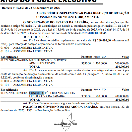 O governo estadual assinou a autorização que prevê a liberação do crédito suplementar para a realização de um novo concurso na Assembleia Legislativa da Paraíba. O documento foi publicado no dia 23 de dezembro. Veja aqui!