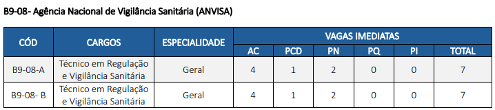 - V. Agência Nacional de Vigilância Sanitária (ANVISA), Cargo: Técnico em Regulação e Vigilância Sanitária, Especialidade: Geral;
