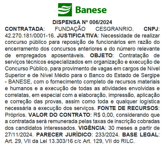 Está definida a banca organizadora do novo concurso público BANESE (Banco do Estado de Sergipe): Fundação Cesgranrio. A informação foi revelada nesta quarta-feira, 4 de dezembro, pelo governador Fábio Mitidieri.