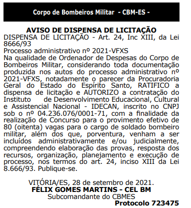 Vale lembrar que, em setembro, o Instituto de Desenvolvimento Educacional, Cultural e Assistencial Nacional (Idecan) teve sua contratação autorizada e retificada pelo subcomandante do CBM RS, coronel Félix Gomes Martins.