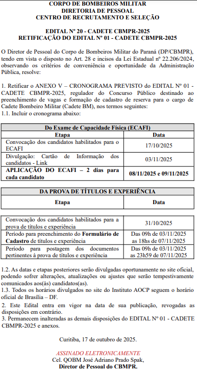 Além disso, o cronograma de atividades foi retificado e informa as datas de 8 a 9 de novembro para realização do ECAFI (Exame de Capacidade Física).