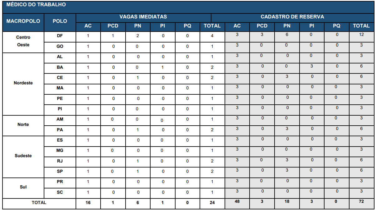 | Médico do Trabalho | 24 + 72 CR |