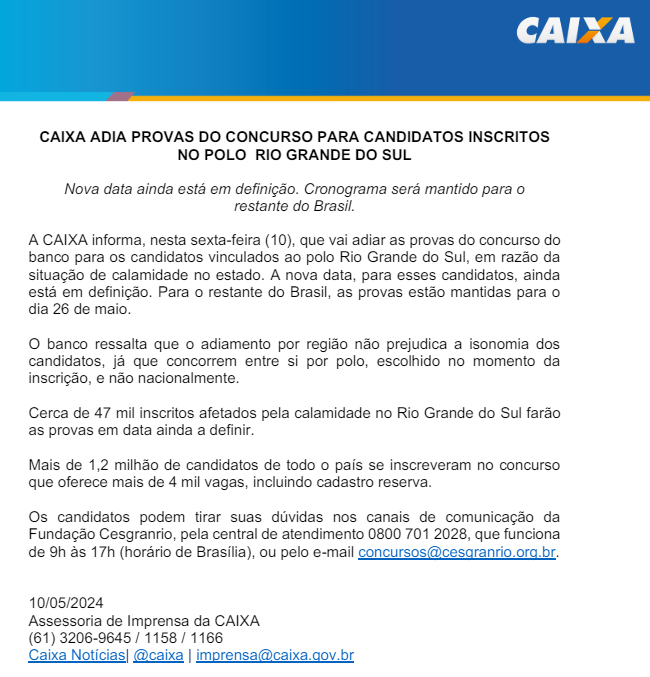 “A CAIXA está sensível, desde o início, à situação de calamidade no Rio Grande do Sul, e vem adotando medidas de apoio aos municípios e à população, buscando, inclusive, alternativas para a realização do certame sem prejuízo aos candidatos.