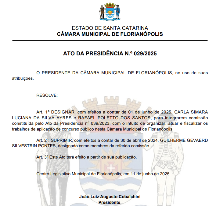 Em junho de 2025, foi alterada a comissão de acompanhamento das atividades do concurso Câmara de Florianópolis. Passaram a compor o grupo os seguintes membros: