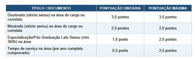 Os títulos aceitos e respectivas pontuações são: