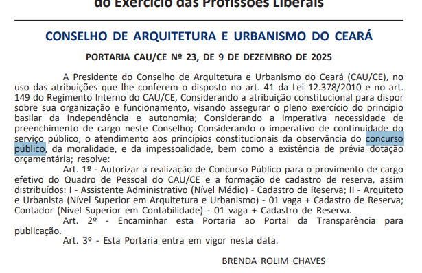 Concurso CAU CE: comissão formada; 2 vagas + CR!