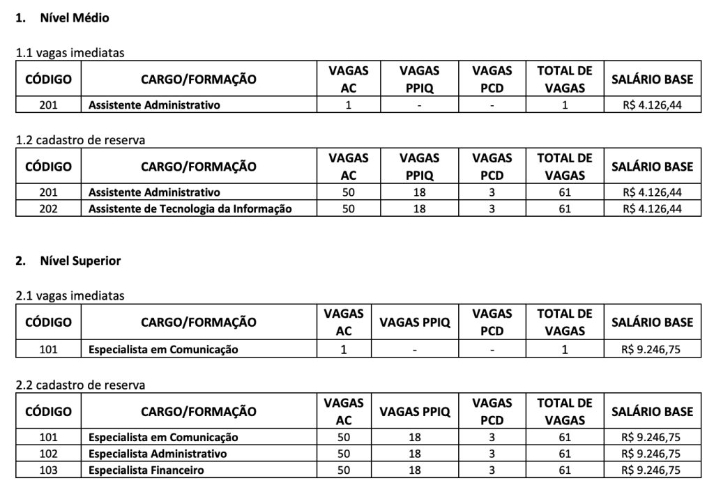 De acordo com o documento, o certame é destinado ao provimento de 2 vagas imediatas e à formação 305 vagas em cadastro de reserva para cargos de níveis médio e superior.