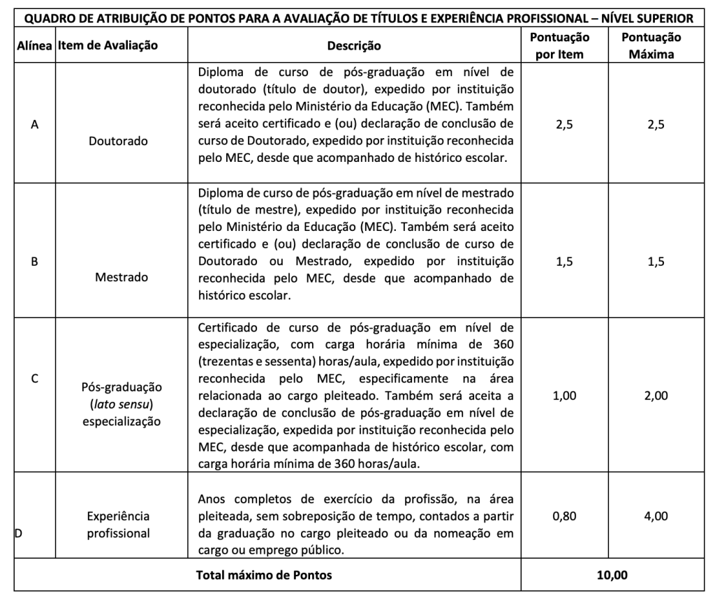 - Avaliação de títulos e experiência profissional (classificatória), para cargos de nível superior.
