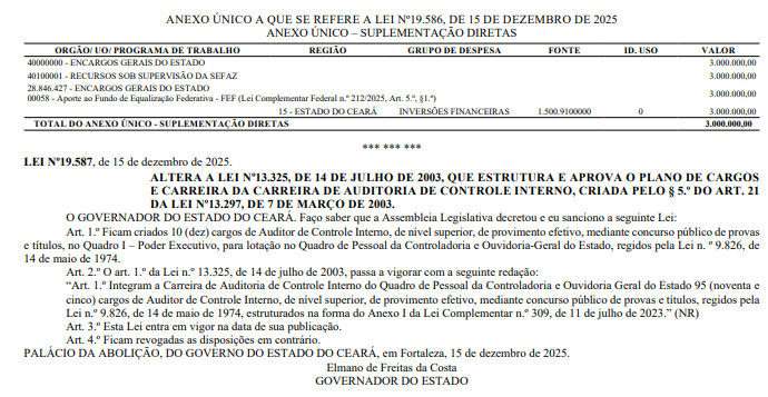 A medida está prevista na Lei nº 19.587, sancionada pelo governador Elmano de Freitas e publicada em 15 de dezembro de 2025. O texto legal autoriza a criação imediata de 10 cargos de Auditor de Controle Interno, função que exige nível superior.