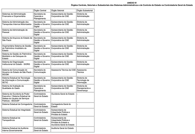 De acordo com o Anexo IV do Decreto nº 69.163/2024 (print abaixo), o órgão central do Sistema Estadual de Auditoria Interna Governamental é a Controladoria Geral do Estadual, cabendo à Auditoria Geral do Estado o papel de órgão setorial.
