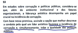 Nela, a liderança antiética favorece a corrupção ao operar esquemas informais paralelos, preservando a fachada institucional e a aparência de racionalidade das políticas. Essa conduta não elimina os processos formais, mas esvazia sua efetividade, capturando decisões, desviando recursos e comprometendo resultados, o que, na prática, inibe a qualidade da política pública, ainda que esta mantenha aparência de legitimidade e coerência.