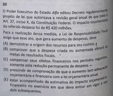 A questão de nº 33 traz cenário em que o Poder Executivo do Estado Alfa editou decreto regulamentando projeto de lei que autoriza a revisão geral anual de que trata o art. 37, X, da CF e pede um requisito previsto na Lei de Responsabilidade Fiscal para que tal medida seja efetivada.