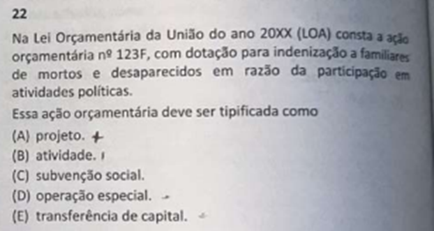 Dessa forma, como redigido o comando da questão, o candidato pode marcar, corretamente, dois gabaritos: letra A (projeto) e letra D (operação especial). Isso acontece porque ao analisar a codificação trazida pela questão (123F), tem-se, necessariamente, um projeto. Por sua vez, ao analisar o tipo de despesa (indenização), tem-se, necessariamente, uma operação especial.