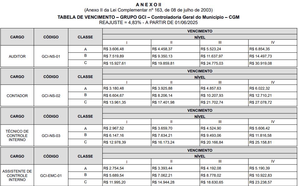 A remuneração dos ocupantes de cargos da carreira da CGM é composta de vencimento (Lei Complementar nº 1.015/2025) e produtividade (art. 39 da LC nº 163/2003).