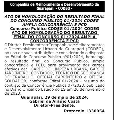 Foi divulgado o resultado final do concurso público CODEG (Companhia de Melhoramentos e Desenvolvimento Urbano de Guarapari), no Espírito Santo, bem como a sua homologação.