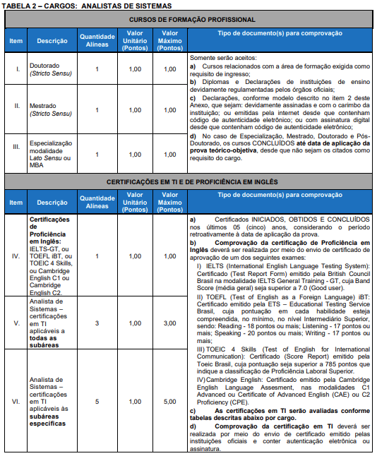 Esta etapa será aplicada somente àqueles candidatos considerados aprovados na Prova Discursiva para os cargos de Analista de Projetos e Analista de Sistemas, tendo caráter classificatório.