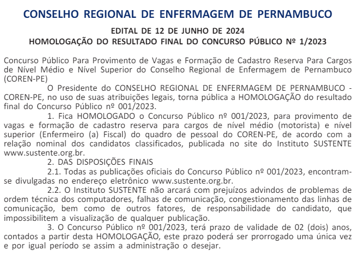 Foi divulgada a homologação do concurso do Conselho Regional de Enfermagem de Pernambuco – COREN PE! Confira abaixo: