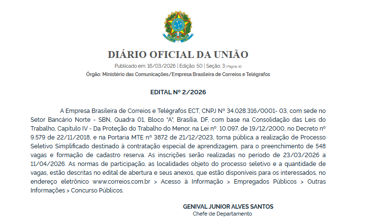 Não fique de fora! Para mais informações sobre o concurso Correios, além do edital para jovem aprendiz, acesse o link abaixo!