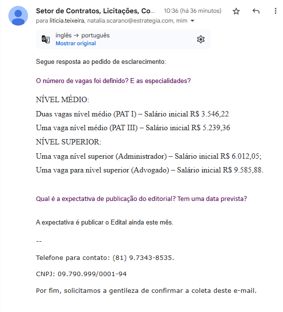 - Uma vaga para nível superior (Advogado) – Salário inicial R$ 9.585,88.