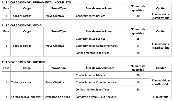 O certame compreenderá as etapas de prova objetiva, de caráter eliminatório e classificatório, para todos os cargos; e avaliação de títulos, de caráter classificatório, para o cargo de nível superior. Conforme abaixo: