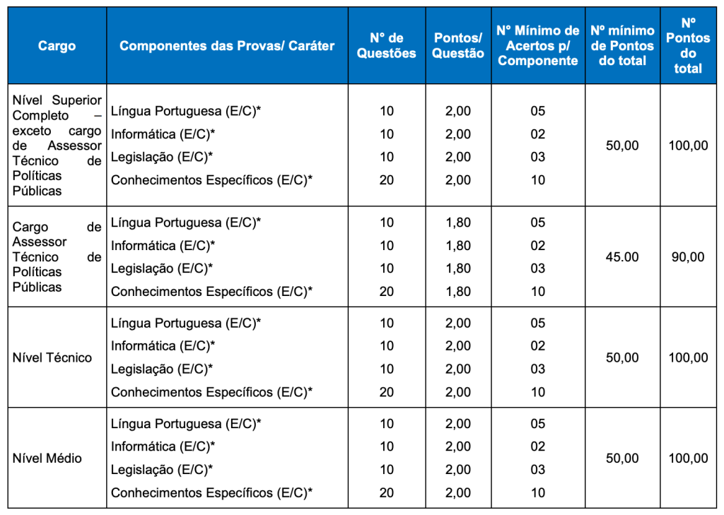 A Prova Teórico-objetiva foi composta de 50 questões de múltipla escolha, com peso de 2 pontos cada, tendo como valor máximo, 100 pontos.