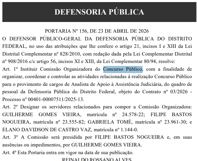 Mais um passo importante e decisivo foi dado para a realização do concurso DPDF (Defensoria Pública do Distrito Federal). A instituição publicou a Portaria que institui oficialmente a comissão organizadora do novo certame.