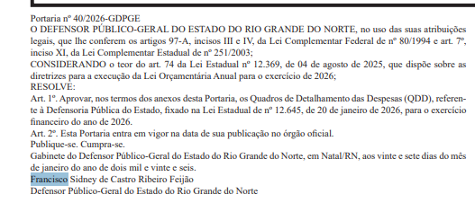 A aprovação do Quadro de Detalhamento da Despesa (QDD) para o exercício de 2026 é mencionada no Diário Oficial do Rio Grande do Norte. Confira: