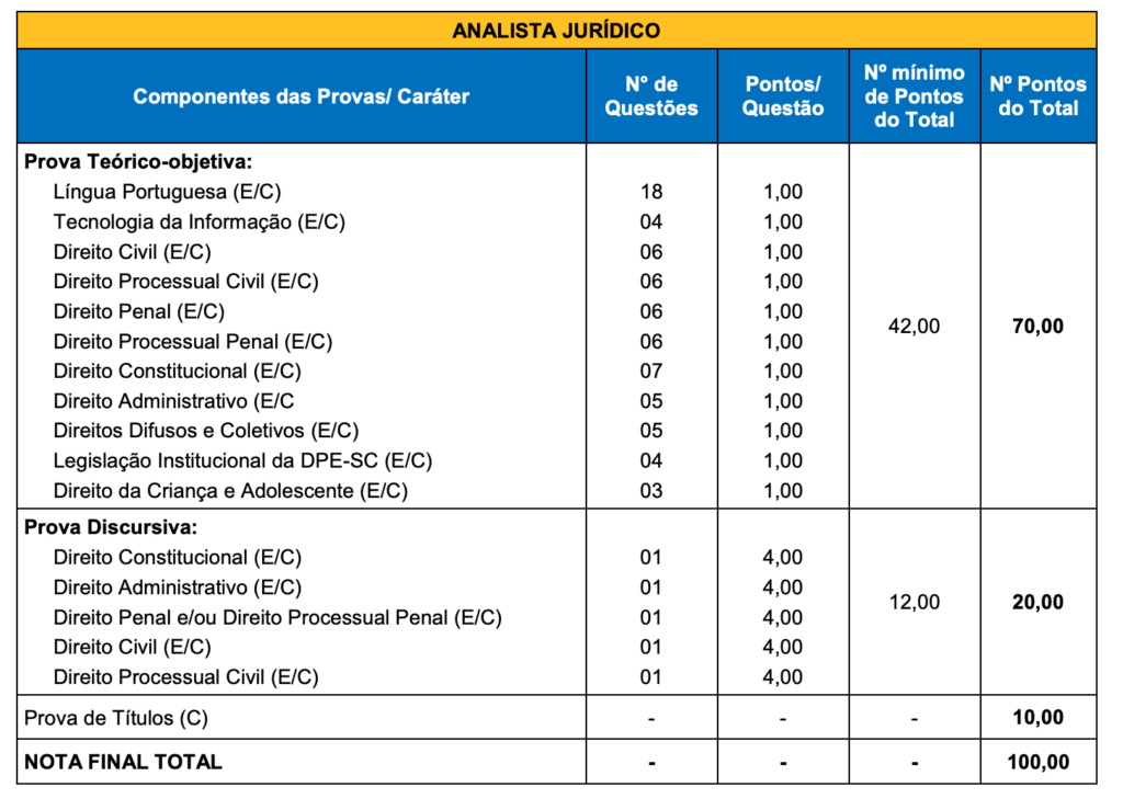 - Prova Discursiva para os candidatos classificados na Prova Teórico-Objetiva no cargo de Analista Jurídico, de caráter eliminatório e classificatório;