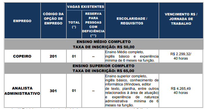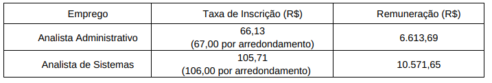 No ETP, por sua vez, constam os valores referentes às taxas de inscrição para cada cargo contemplado. Confira abaixo: