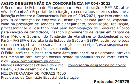 Foi publicado, no Diário Oficial do Pará, o aviso de suspensão do processo de licitação para escolha da banca que será responsável pelo próximo concurso FASEPA.