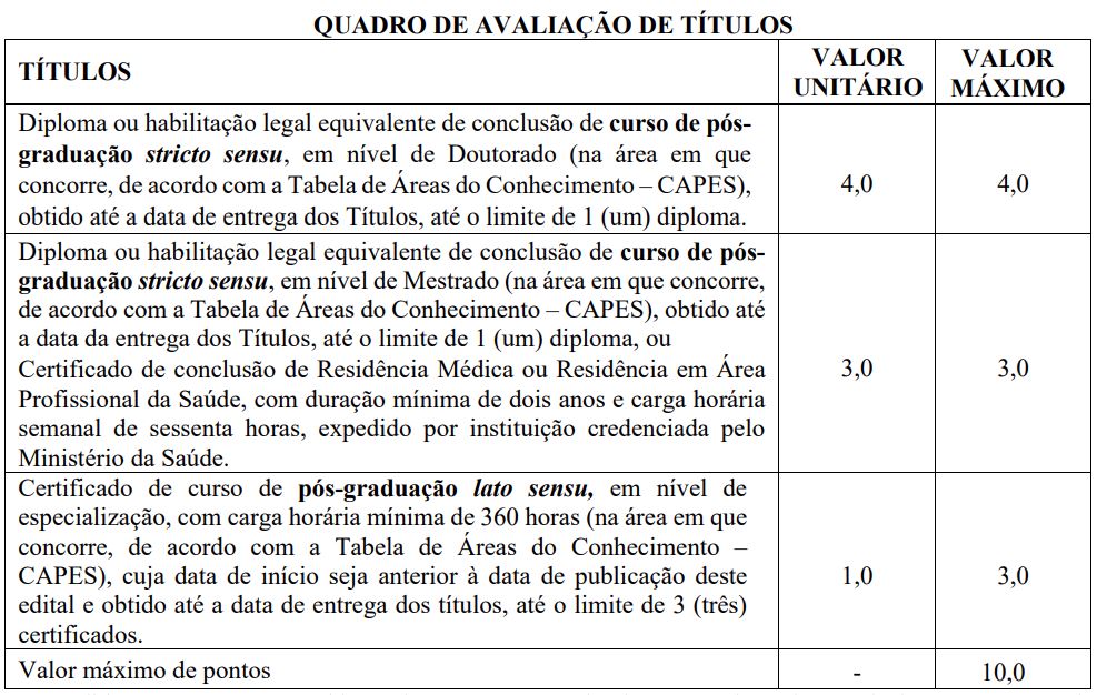 A prova terá o valor máximo de 10,0 (dez) pontos, atribuídos de acordo com o Quadro de Avaliação de Títulos, como discriminado no quadro a seguir: