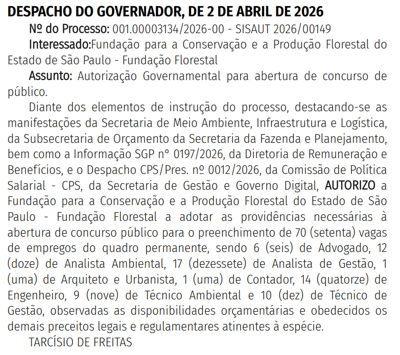 A Fundação para a Conservação e a Produção Florestal do Estado de São Paulo foi autorizada a realizar um novo concurso público, que contará com 70 vagas distribuídas em cargos de níveis técnico e superior: