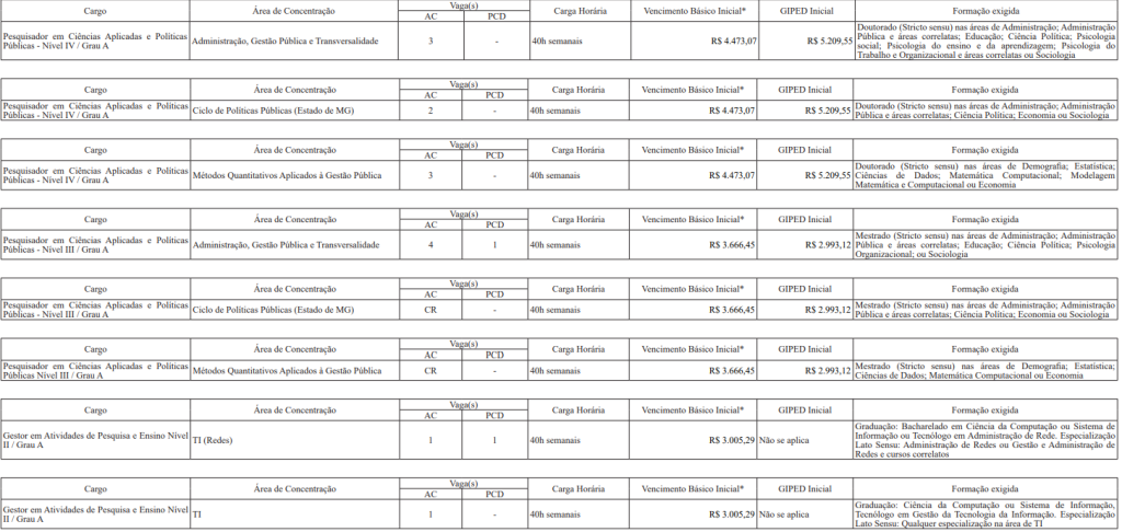 Para os cargos de Pesquisador em Ciências Aplicadas e Políticas Públicas (Doutorado) e Pesquisador em Ciências Aplicadas e Políticas Públicas (Mestrado):