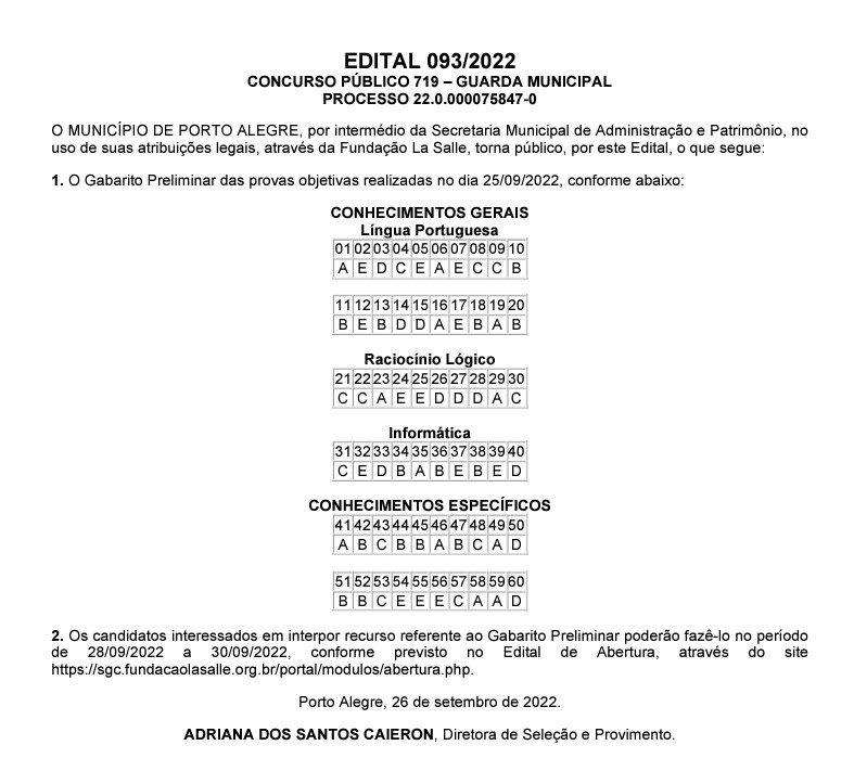 Foi divulgado nesta segunda-feira, 26 de setembro, o gabarito preliminar das provas objetivas do concurso Guarda de Porto Alegre.
