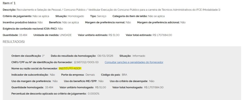 No dia 08 de janeiro de 2026 foi divulgado no Portal Nacional de Contratações Públicas que o Instituto AOCP será a banca organizadora do certame. Veja: