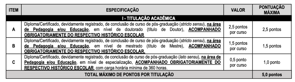 Esta etapa terá a pontuação máxima de 5 (cinco) pontos, ainda que a soma dos valores dos títulos apresentados seja superior a