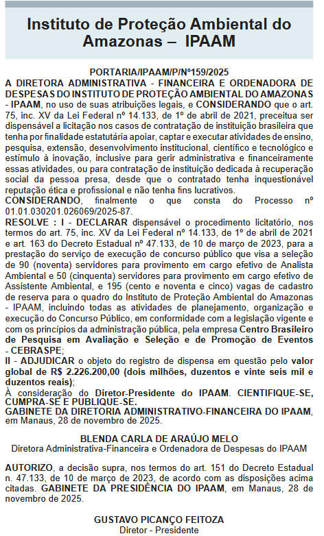 A autorização do concurso público IPAAM foi oficializada pelo governador por meio de suas redes sociais, no dia 10 de outubro de 2025. Ao todo, foram confirmadas 140 vagas, com a publicação do edital até o final do ano.