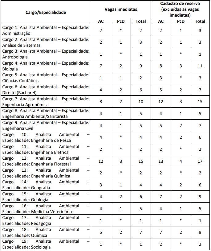 | Analista Ambiental (Nível Superior – Diversas Áreas) | 90 | 120 | 210 | R$ 11.692,22 |