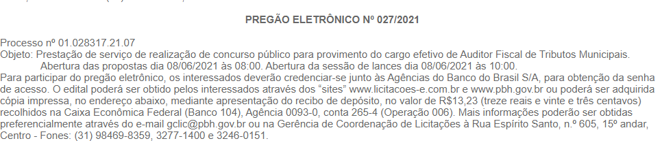 Além da RBO, também participaram do pregão eletrônico para escolha da banca do concurso ISS BH as seguintes empresas: