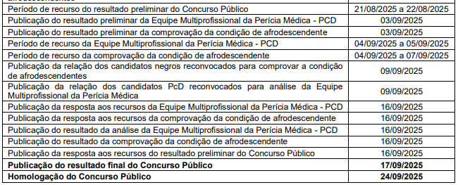 De acordo com o cronograma do certame, a homologação será publicada no dia 24 de setembro. A partir daí, será iniciada a validade de dois anos.