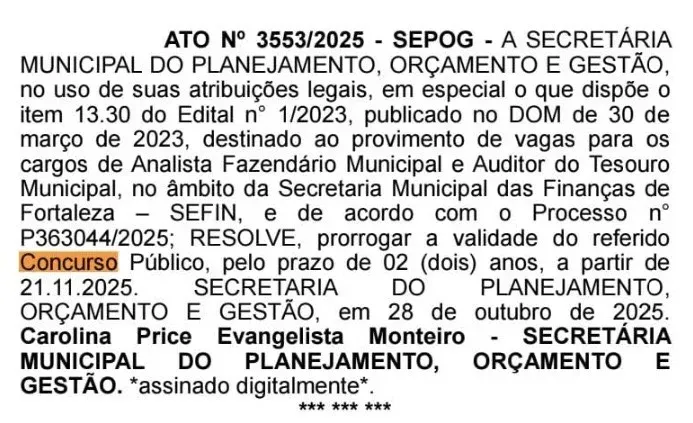 O último concurso da Secretaria Municipal de Finanças de Fortaleza aconteceu em 2023, sob organização do Cebraspe.